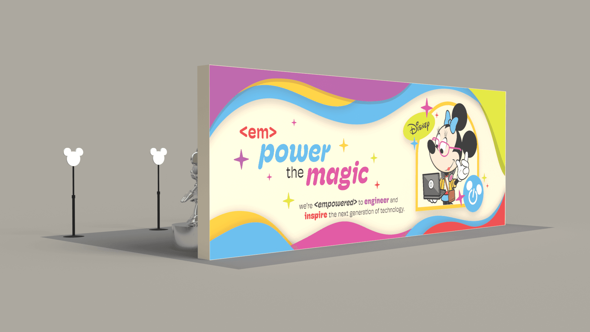 Grace Hopper Celebration (GHC) is recognized as the world’s largest gathering of women in technology, bringing together thousands of professionals from around the globe to learn, connect, and celebrate their achievements. For this three-day event, I designed the booth, signage, and event collateral using Disney’s <em>power the magic branding.