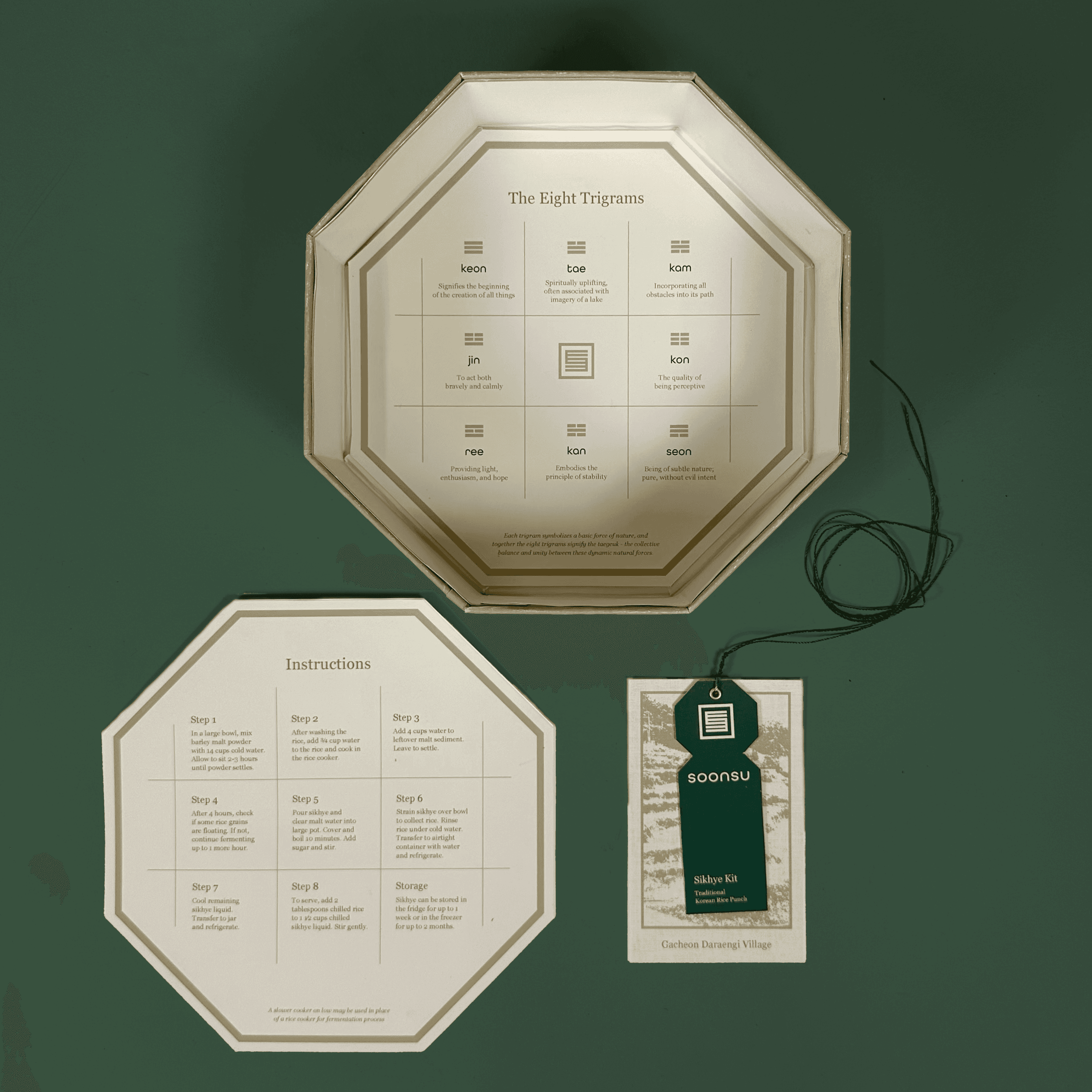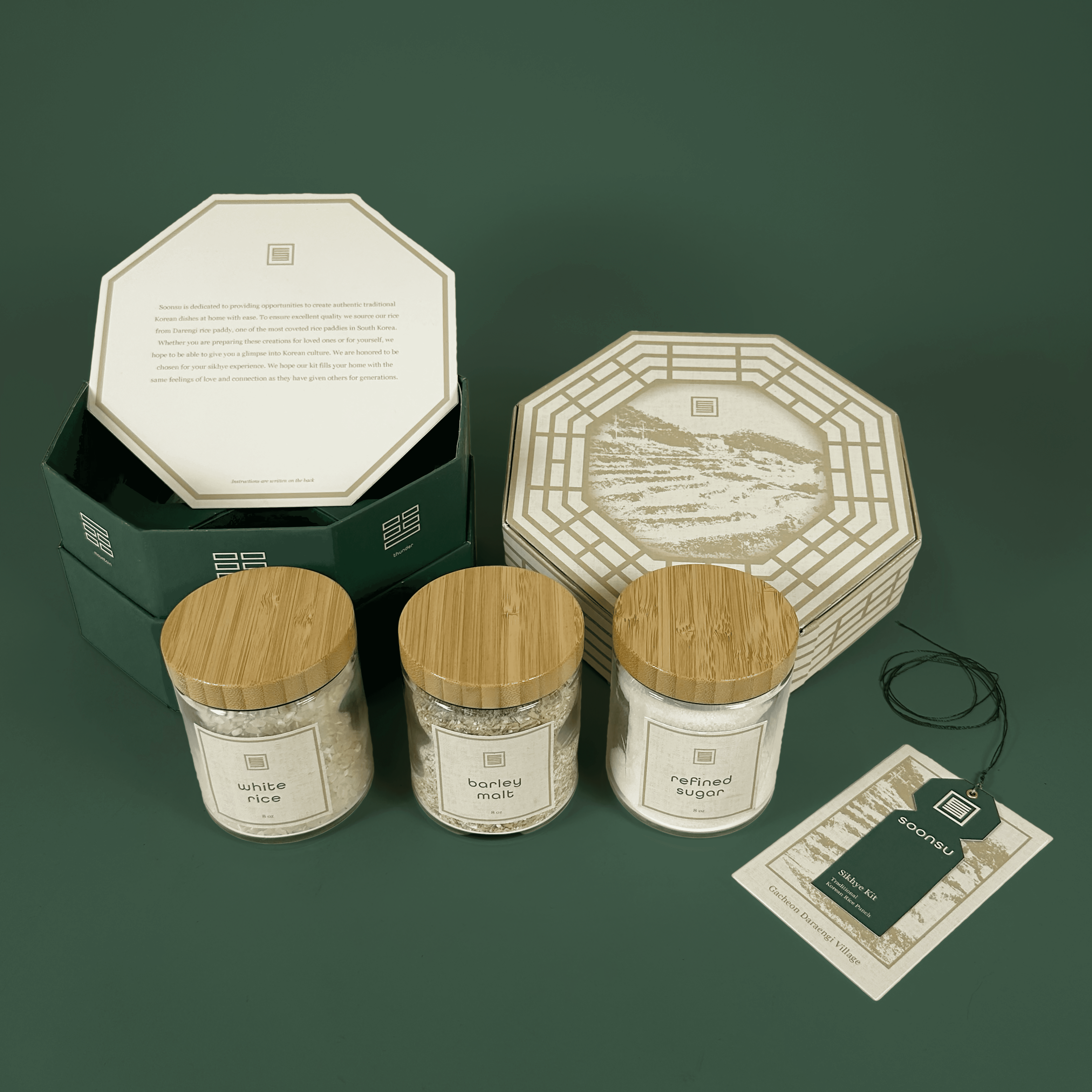 Soonsu is dedicated to providing opportunities to create authentic traditional Korean dishes at home with ease. The shikhye kit houses all the necessary ingredients for the sweet rice punch. From the bojagi to the geometric motifs and forms, the kit is intentionally designed to fully immerse the user in Korean culture.
